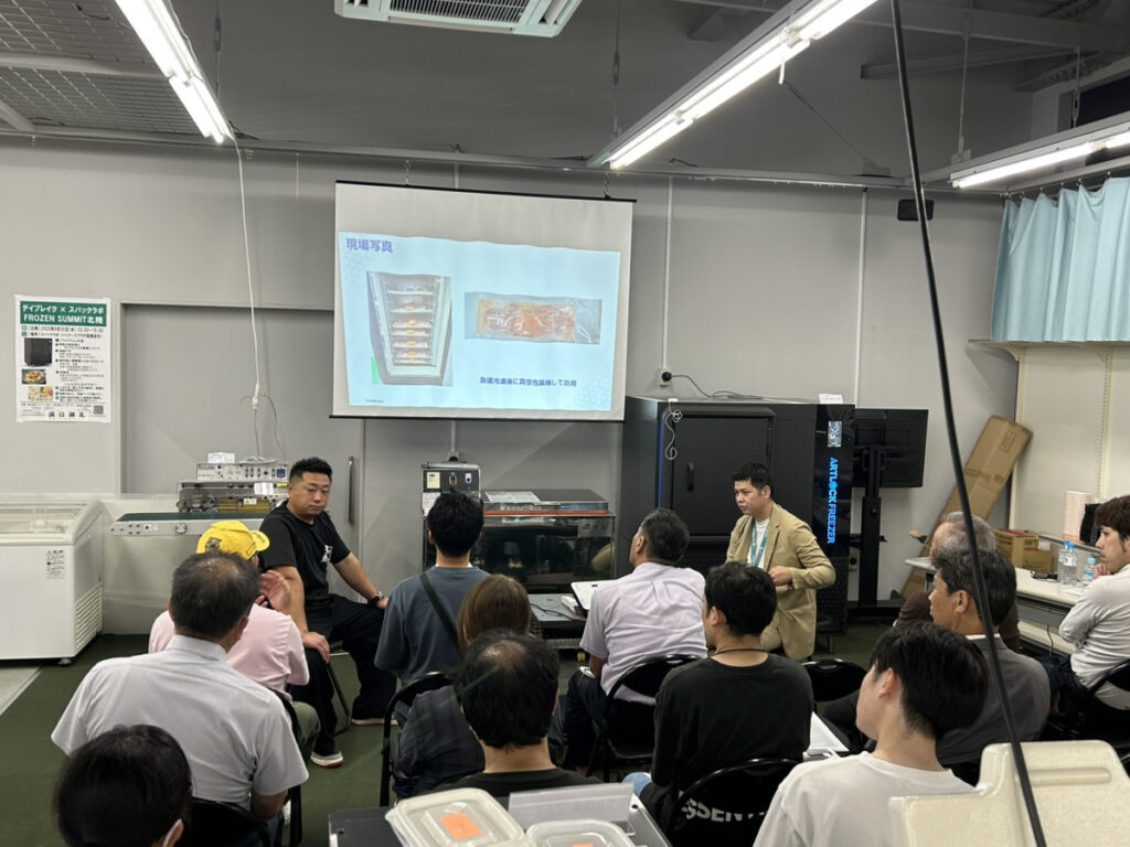 2025年8月20日スパックラボ(パッケージプラザ高岡店内)にて「FROZEN SUMMIT in 北陸」を初開催いたしました。このイベントを通して北陸の皆様に急速冷凍機の活用方法や様々なお悩み解決などにお役に立てたらという思いから今回このようなイベントをデイブレイク様ご協力の元、開催する運びとなりました。今回はお寿司屋さん、鮮魚店さん、洋菓子屋さんなど約20名の方にご参加いただきました。ご参加くださった皆様ありがとうございました。