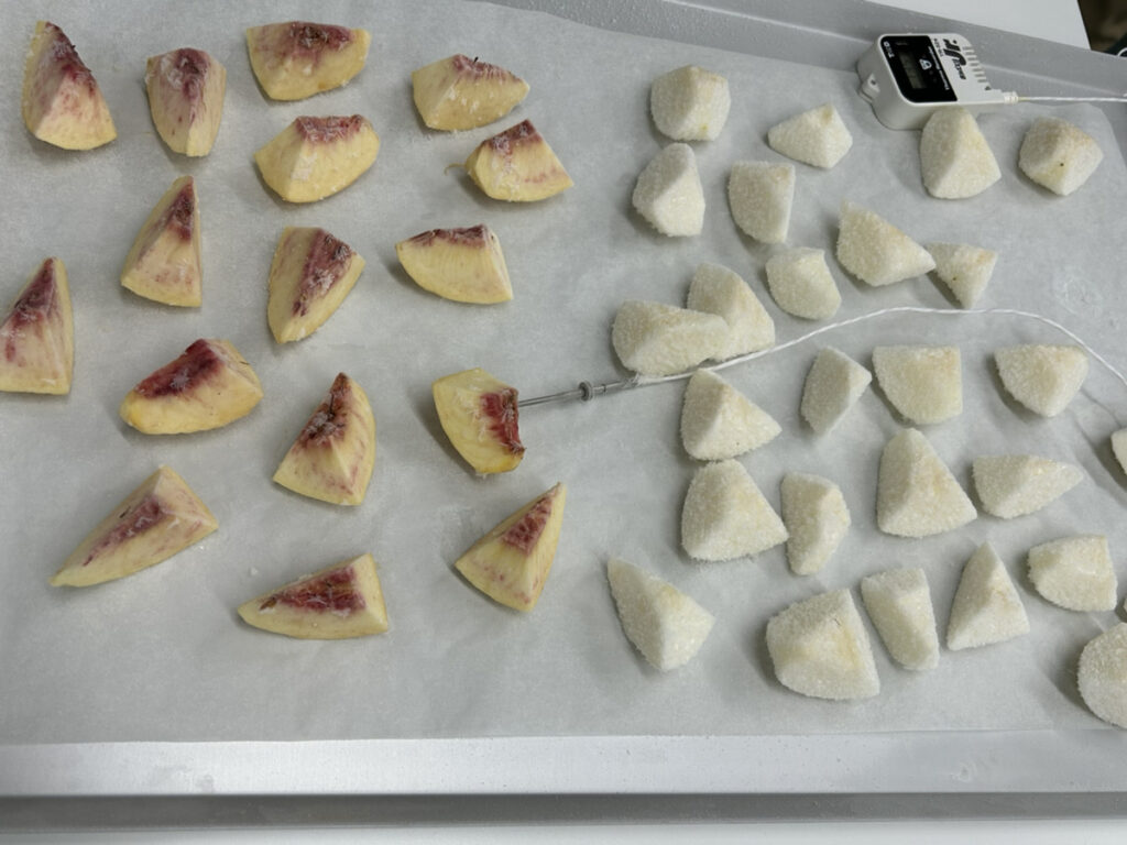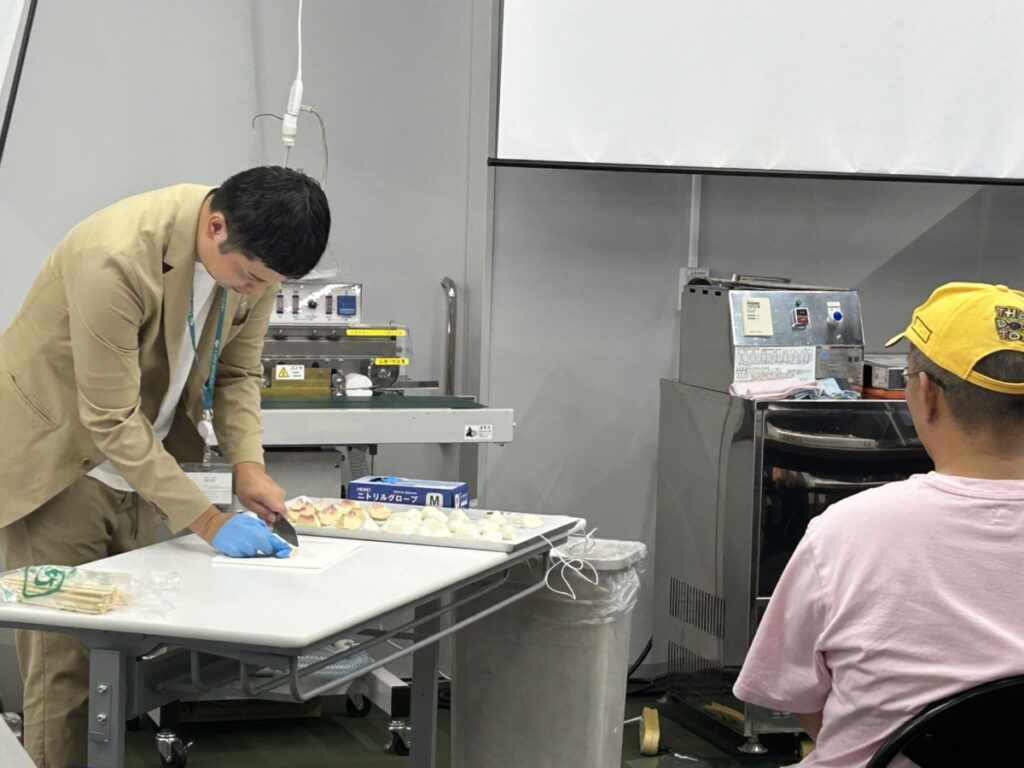 急速冷凍の試食会では、お寿司、フルーツ(ぶどう・梨・桃)、シフォンケーキ、ご飯、ホタルイカを行いました。フルーツは実際に包丁で切っていただき、急速冷凍ならではのサクッと包丁が入るのも体験していただきました。シフォンケーキも一度冷凍したとは思えないほどフワフワで試食していただいた皆様にも急速冷凍の良さ、すごさを感じていただけたと思います。